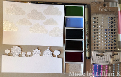 The scene is one layer, I used masking paper over the images while I coloured the sky and embossed the snow.